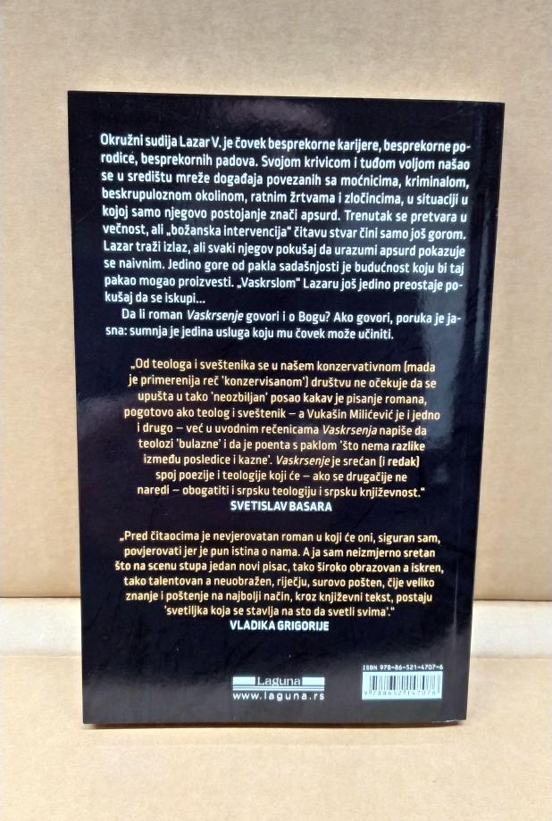 „ Od teologa i sveštenika se u našem konzervativnom (mada je primerenija reč ’konzervisanom’) društvu ne očekuje da se upušta u tako ’neozbiljan’posao kakav je pisanje romana, pogotovo ako teolog i sveštenik – a Vukašin Milićević je i jedno i drugo – već u uvodnim rečenicama Vaskrsenja napiše da teolozi ’bulazne’i da je poenta s paklom ’što nema razlike između posledice i kazne’. Vaskrsenje je srećan (i redak) spoj poezije i teologije koji će – ako se drugačije ne naredi – obogatiti i srpsku teologiju i srpsku književnost. “ – Svetislav Basara