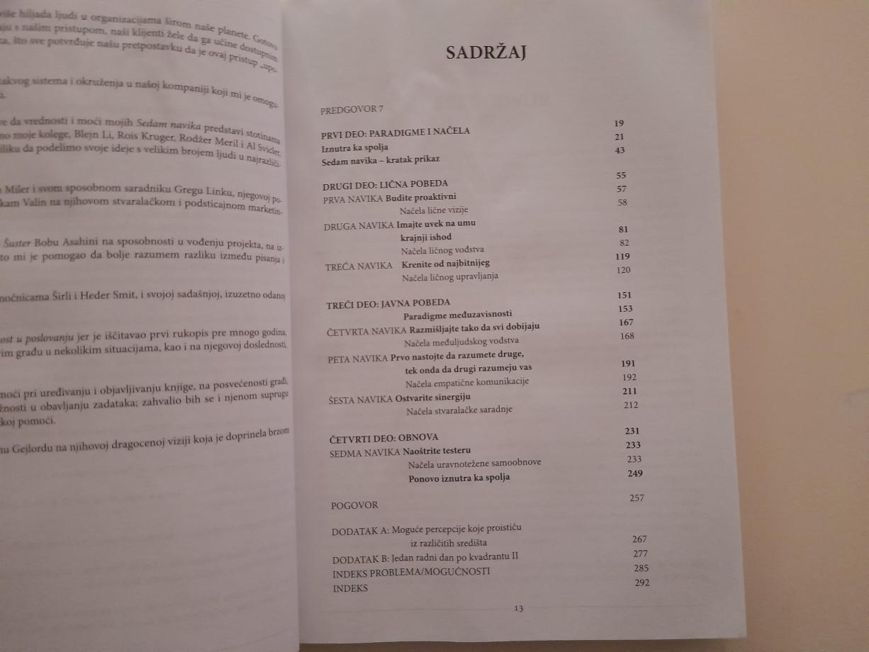 Knjiga je strukturirana oko sedam temeljnih navika koje vode ka stvaranju karaktera, razvijanju međuljudskih odnosa i izgradnji dugoročne efikasnosti - kako u privatnom tako i u profesionalnom životu. Bilo da je čitate prvi put ili joj se vraćate iznova, ova knjiga nudi bogat i sistematičan okvir za postizanje ličnog i kolektivnog uspeha.