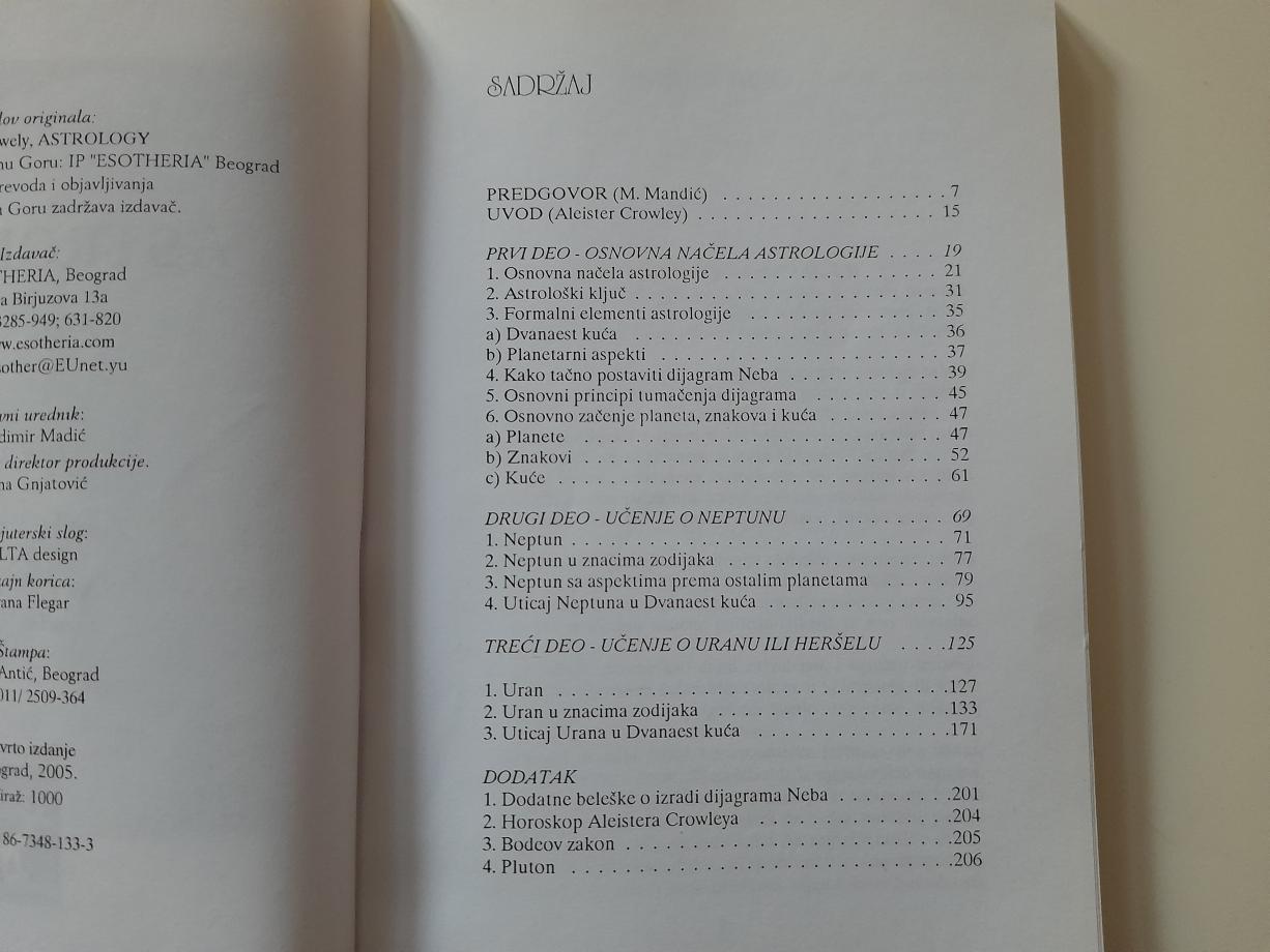 Astrologija - Krouli astroloski besteler s početka devedesetih ponovo među vama! Kroulijeva lucidnost je u astrologiji pronašla moćno oružje prodora u više sfere svesti. Knjiga sadrži obimne studije Urana i Neptuna.