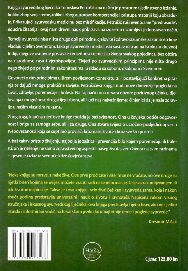Prikazujući ajurvedsku medicinu bez mistifikacije, Petrušić ruši predrasude, edukuje čitaoca i ovu drevnu nauku približava na izuzetno razumljiv i jednostavan način.