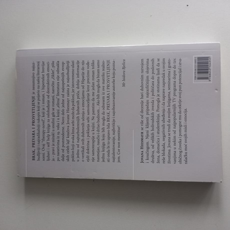 „Brak, prevara i prosvetljenje je nesumnjivo najuzbudljiviji i najradikalniji rukopis koji se pojavio na našoj literarnoj sceni. Ovaj `therapy-novel`, koji je i roman, i hipertekst brevijar ljubavi i self help knjiga za oslobađanje od destruktivnih emocija – pravi je mirakl u sredini gde se romani, naročito `čiklet`, pišu po narativima iz 19. veka i u kojoj `elitna` literatura nije odmakla dalje od postmoderne. Novo delo jedne od najuspešnijih evropskih celeb lajf koučeva Jovane Hiesmayr zaista je najuzbudljiviji poklon koji svaka žena sebi može da pokloni, jer istovremeno ulazi u jednu od najturbulentnijih ljubavnih priča, dobija informacije o vertikali svih duhovnih učenja o emocijama od Hipatije do nju ejdž doktrina i poklanja sebi samoisceljenje kroz precizno vođenje samoterapije u knjizi. Ne pamtim da me jedan roman toliko nasmejao, naučio i držao budnom... Ako bih mogla da biram samo jednu knjigu koju bih mogla da odnesem iz ove matriks realnosti onda bi to upravo bila Brak, prevara i prosvetljenje najtalentovanije, najbritkije i najobrazovanije autorke koju poznajem. Cor non mentitur!“