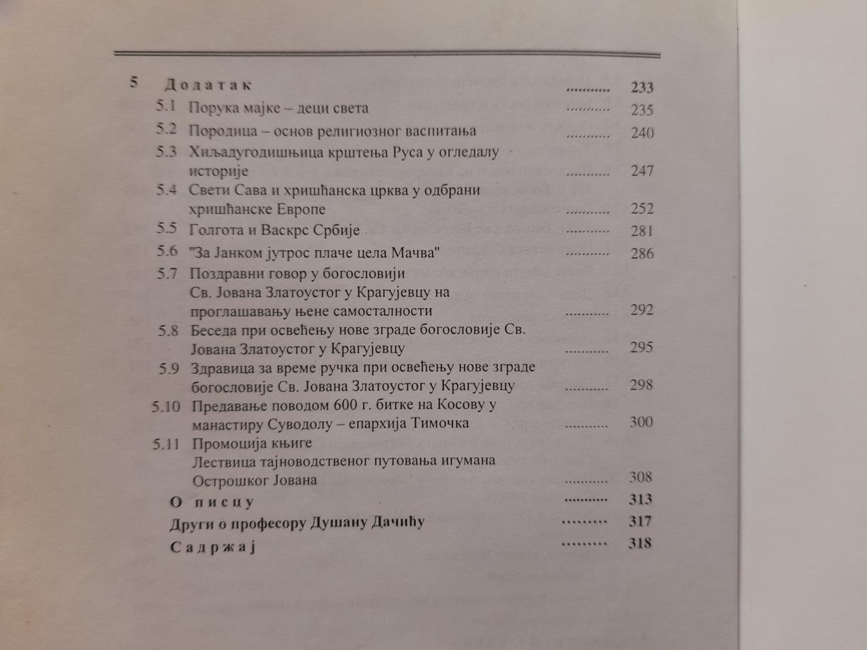 Душан М. Дачић, протојереј, ректор богословије, писац (Багрдан код Јагодине, 2. VIII 1924 - Београд, 14. IV 2009). По завршеној Учитељској школи у Јагодини, радио је две године као учитељ (Багрдан, Ловци, Кочино село, Деоница), а потом уписао и завршио Богословски факултет (1946-1950). У чин ђакона рукоположен је 1958, а у чин свештеника 1978, поставши одмах протојереј. У призренској богословији радиo као суплент (1952-1960), a потом као стипендиста Светског савета цркава из Женеве слушаo у Бону предавања из религијске педагогије (1960-1964). Професор и васпитач Богословије Св. Арсенија Сремца у Сремским Карловцима (1964-1978), ректор Богословије Св. Саве у Београду (1978-2001). Као пензионер постављен је за инспектора богословија. Орденом Св. Саве одликован је 1994. Оставио је видан траг у богословској просвети Српске цркве у последњих пола века. Бавио се проблемима педагогије и методике (Методика религијске наставе, Бг 1954; Вероучитељ, носилац духовне обнове народа, Нова Пазова 2003), а највише методичким приручницима за наставу књижевности на богословијама (Монах Теодосије Хиландарац, Бг 1974). Био је сарадник већине црквених листова и часописа, а у Светосавском звонцу, Православној мисли и Веснику свештеничког удружења имао је сталне рубрике. Писао је поезију (Поема о Хиландару, Бг 1982; Бајка за мртве, Бг 1994; Поема о Јасеновцу, Бг 1994), романе (Камиље појило, Бг 1992; Са обала Камиљег појила, Бг 2001), репортаже, сценске приказе, рецитале. Преводио је Н. Берђајева са немачког и В. Зјенковског са руског.