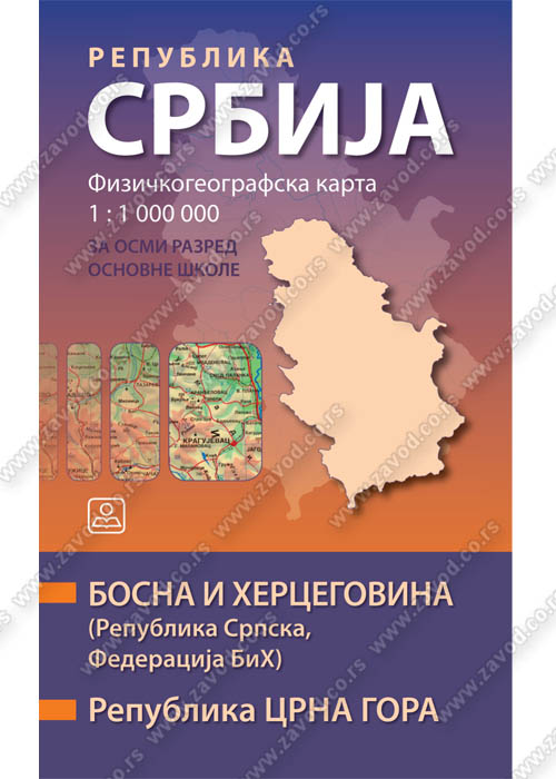 Zavodova fizioško-geografska karta Republike Srbije razmera 1:1.000.000 za osmi razred osnovne škole.