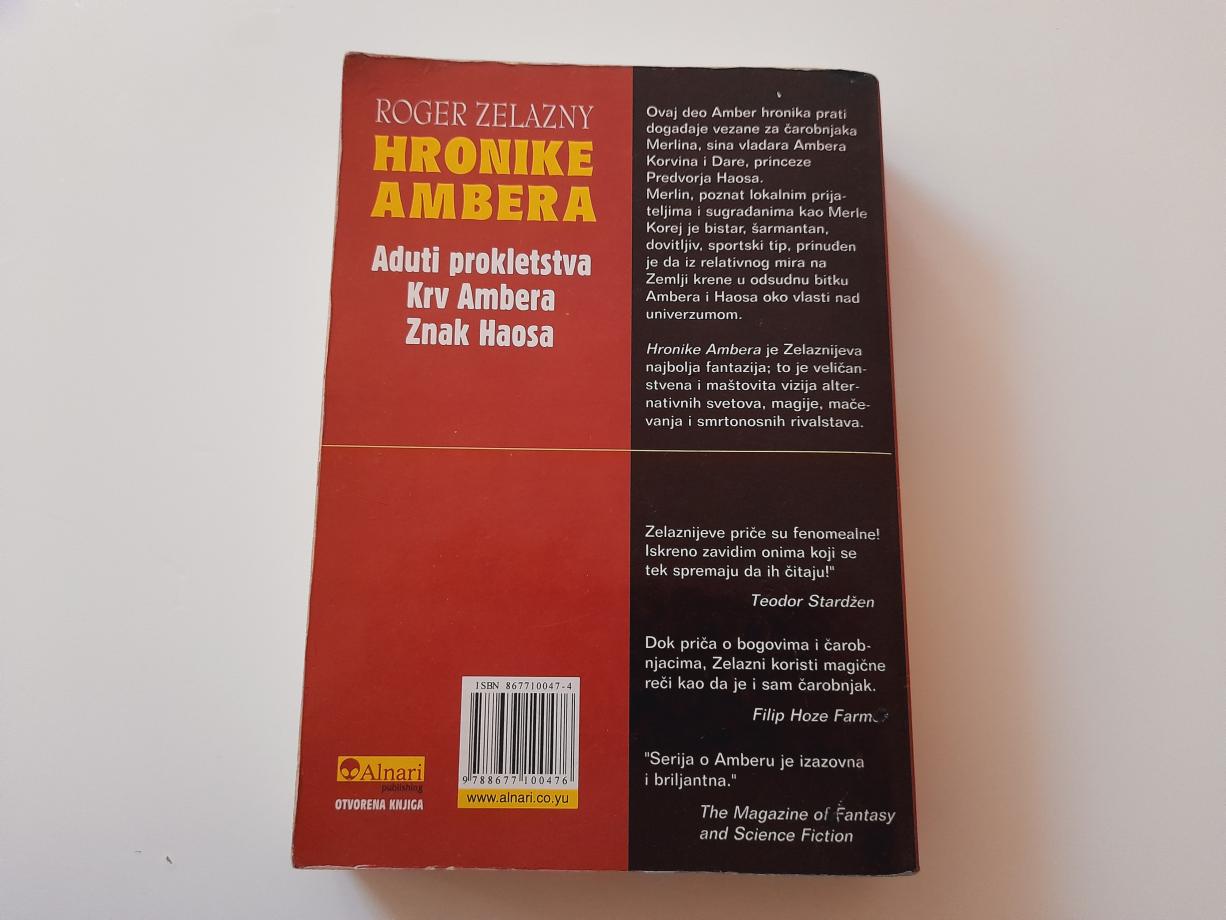 Serijal Hronike Ambera je klasik fantastike; sastoji se od deset delova, objavljivanih između 1970. i 1991. U ovom tomu sadržani su šesti roman, Aduti prokletstva, sedmi, Krv Ambera, i osmi, Znak Haosa. Ovim počinje drugo petoknjižje, serijal o Merlinu.
