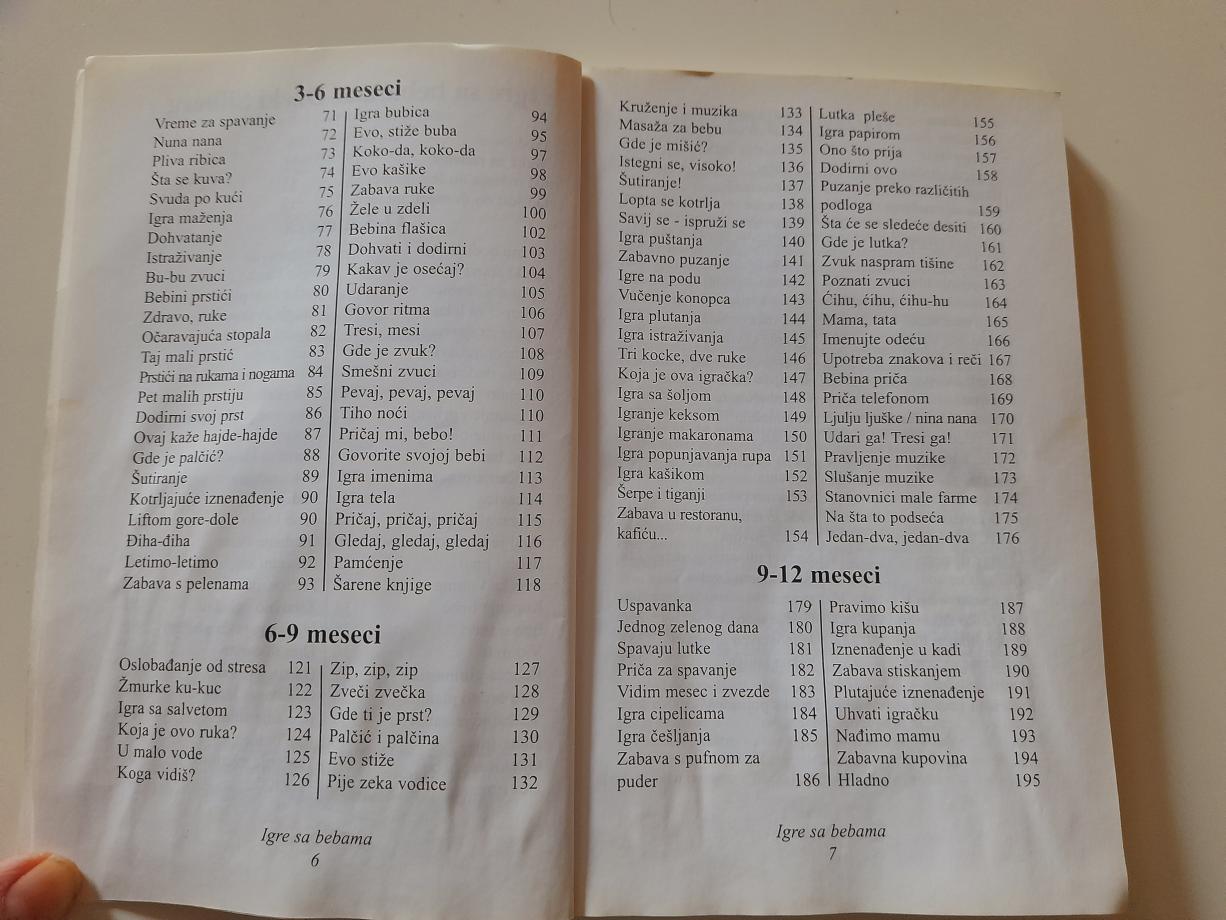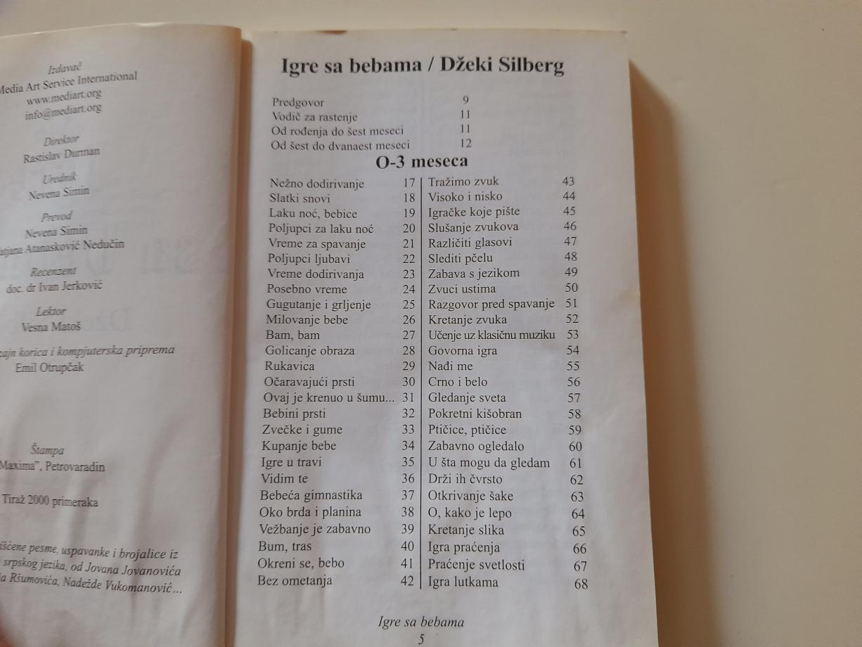 Reč je o svojevrsnom vodiču za roditelje-početnike, koji nudi 230 igara da beba radosno raste, od dolaska na svet pa do kraja prve godine. Ovu zanimljivu i korisnu knjigu sa engleskog na srpski prevele su Nevena Simin i Tatjana Atanasković Nedučin, uz krajnje instruktivne ilustracije Emila Otrupčaka.Mnoga naučna istraživanja potvrdila su da je dete sposobno za suptilne komunikacije sa okolinom, odmah po rođenju, a to se prvenstveno odnosi na roditelje. Mada su joj vid i sluh u tom periodu slabi, bebina kožna osetljivost, pa i ravnoteža, sasvim dobro funkcionišu za bliske, nežne kontakte. Ova knjiga će razbiti zabludu da uputstvo za igre sa bebama nije potrebno, da se takvo iskustvo prenosi s kolena na koleno i da samo treba biti spontan.