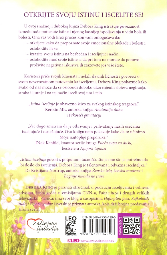 Autorka Debora King smatra da postoji veza između potisnute istine i bolesti u vidu koje se ona kasnije ispoljava. Debora će vam pomoći kako da uočite svoje emocionalne blokade i bolesti i kako da ih se oslobodite. Takođe, naučiće vas kako da izrazite svoju istinu na isceljujući način i kako da oslobodite moć svoje istine, a da pri tom nemate negativnih iskustava.