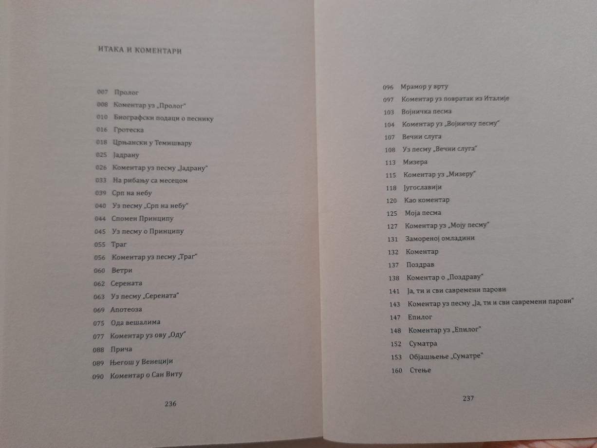 Izdanje „Itake i komentaraׅ“ možemo posmatrati kao antologiju te antologije, za koju je sam autor izvršio selekciju, odabravši nešto više od trećine pesama i pri tome dodavši nove, čime je zaokružio celinu.