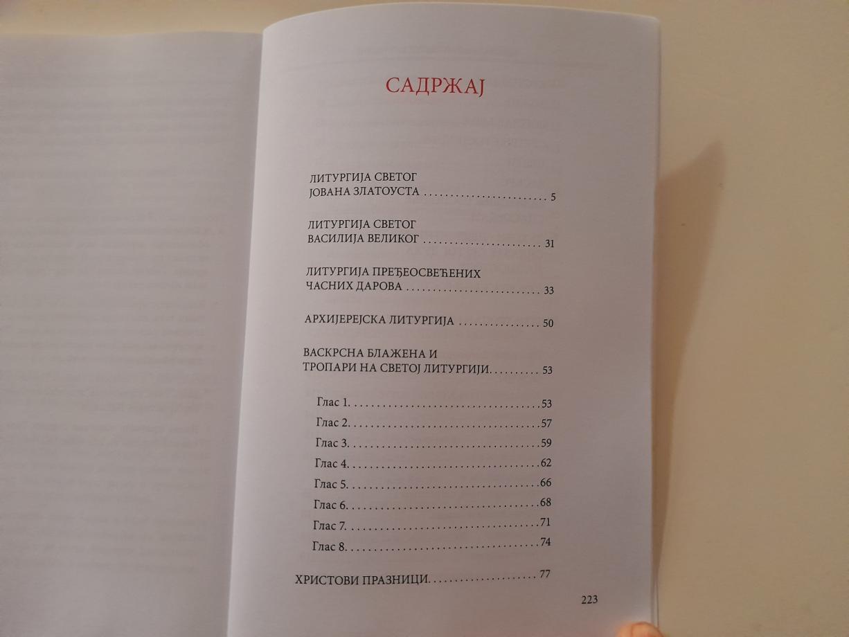 U knjizi se nalaze blažena, antifoni, tropari kondaci i prokimeni.