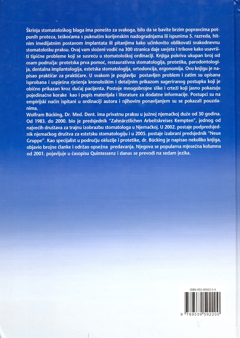 Škrinja stomatološkog blaga ima ponešto za svakoga, bilo da se bavite brzim popravcima potpunih proteza, teškoćama s puknutim korijenskim nadogradnjama ili ispunima 5. razreda, hitnim imedijatnim postavom implantata ili pitanjima kako učinkovito oblikovati svakodnevnu stomatološku praksu. Ovaj vam složeni vodič na 300 stranica daje savjete i trikove kako usavršiti tipične probleme koji se susreću u stomatološkoj ordinaciji. Knjiga pokriva ukupan broj od osam područja: protetska prva pomoč, restaurativna stomatologija, protetika, parodontologija, dentalna implantologija, estetska stomatologija, ortodoncija, ergonomija. Ovu knjigu je napisao praktičar za praktičare. U svakom je poglavlju postavljen problem i zatim su opisana isprobana i uspješna rješenja kronološkim i detaljnim prikazom sugeriranog postupka koji je obično prikazan kroz slučaj pacijenta. Postoje mnogobrojne slike i crteži koji jasno pokazuju pojedinačne korake kao i popis materijala i literature za dodatne informacije. Postupci su na empirijski način ispitani u ordinaciji autora i njihovim ponavljanjem su se pokazali pouzdanima.