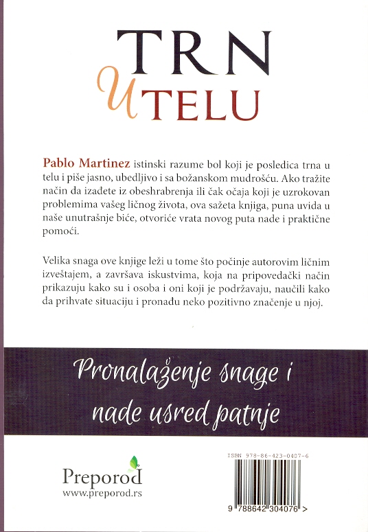 Jednostavna, sažeta i ubedljiva knjiga koja će vam pomoći da povratite samopouzdanje, da izađete iz očaja i problema. Knjiga Trn u telu otvoriće vam nov put nade i pružiće vam praktičnu pomoć kako da se oslobodite patnje, kako da prihvatite situaciju u kojoj se nalazite i na nju gledate s pozitivne strane.