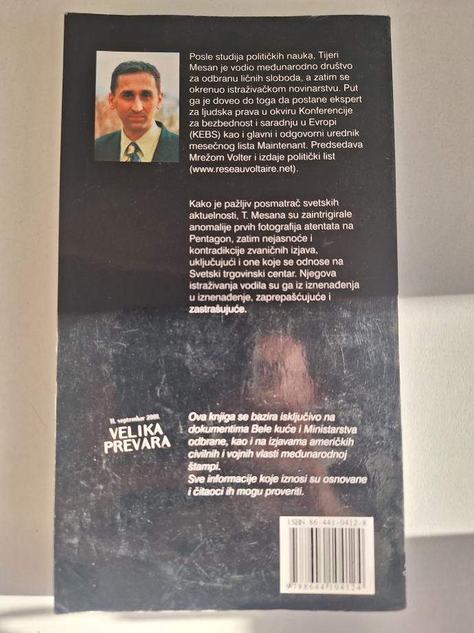 Poznati publicista i novinar, Tjeri Mesan uocava brojne nepravilnosti povodom napada na Pentagon 11. septembra 2001.godine. Formira istrazivacki tim i dolazi do senzacionalnih otkrića. Ova knjiga je potkrepljena činjenicama i predstavlja značajan dokument o ovom događaju.