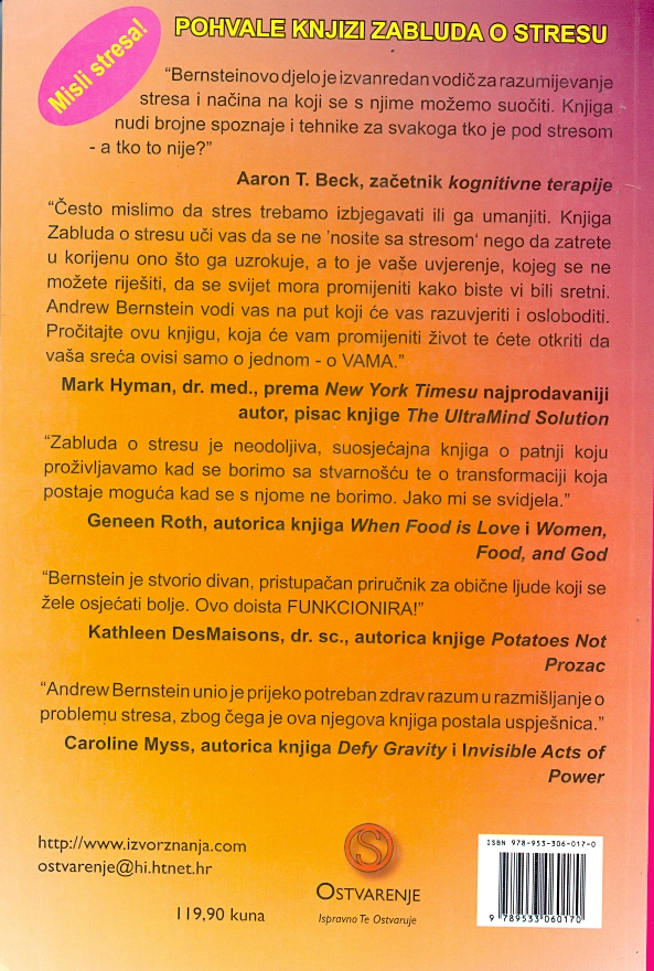 "Često mislimo da stres trebamo izbjegavati ili ga umanjiti. Knjiga Zabluda o stresu uči vas da se ne ’nosite sa stresom‘ nego da zatrete u korijenu ono što ga uzrokuje, a to je vaše uvjerenje, kojeg se ne možete riješiti, da se svijet mora promijeniti kako biste vi bili sretni. Andrew Bernstein vodi vas na put koji će vas razuvjeriti i osloboditi. Pročitajte ovu knjigu, koja će vam promijeniti život te ćete otkriti da vaša sreća ovisi samo o jednom - o VAMA."