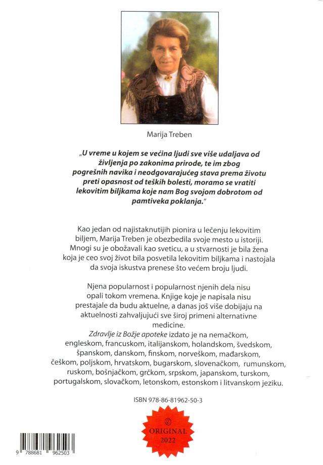 Knjiga Zdravlje iz Božje apoteke autorke Marije Treben predstavlja dragoceni vodič kroz svet lekovitog bilja i njegove primene u očuvanju i poboljšanju zdravlja.